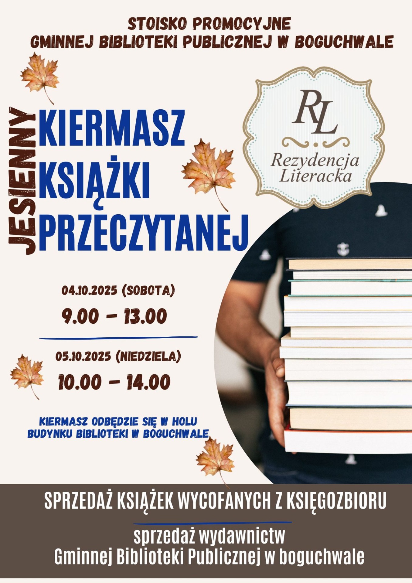 Serdecznie zapraszamy wszystkich miłośników literatury na Jesienny Kiermasz Książki Przeczytanej, który odbędzie się w Bibliotece w Boguchwale.