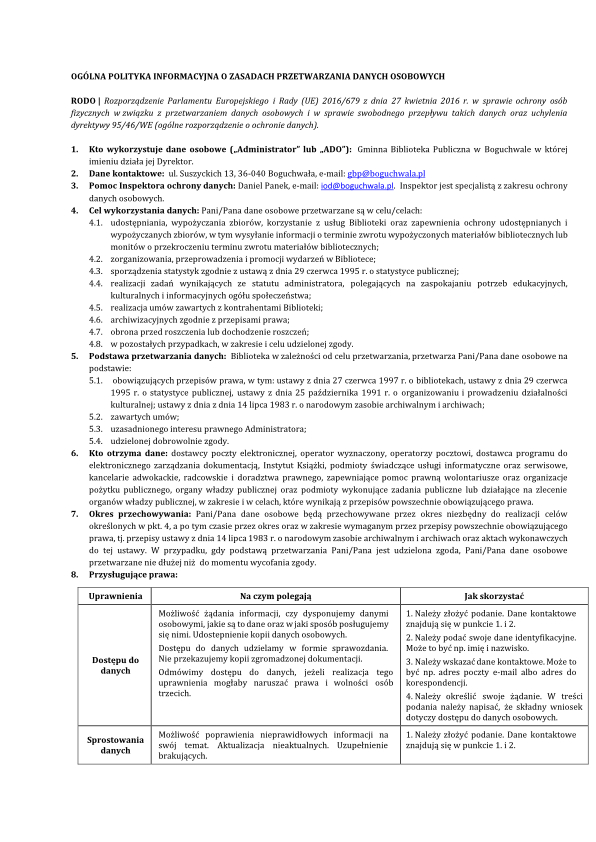OGÓLNA POLITYKA INFORMACYJNA O ZASADACH PRZETWARZANIA DANYCH OSOBOWYCH