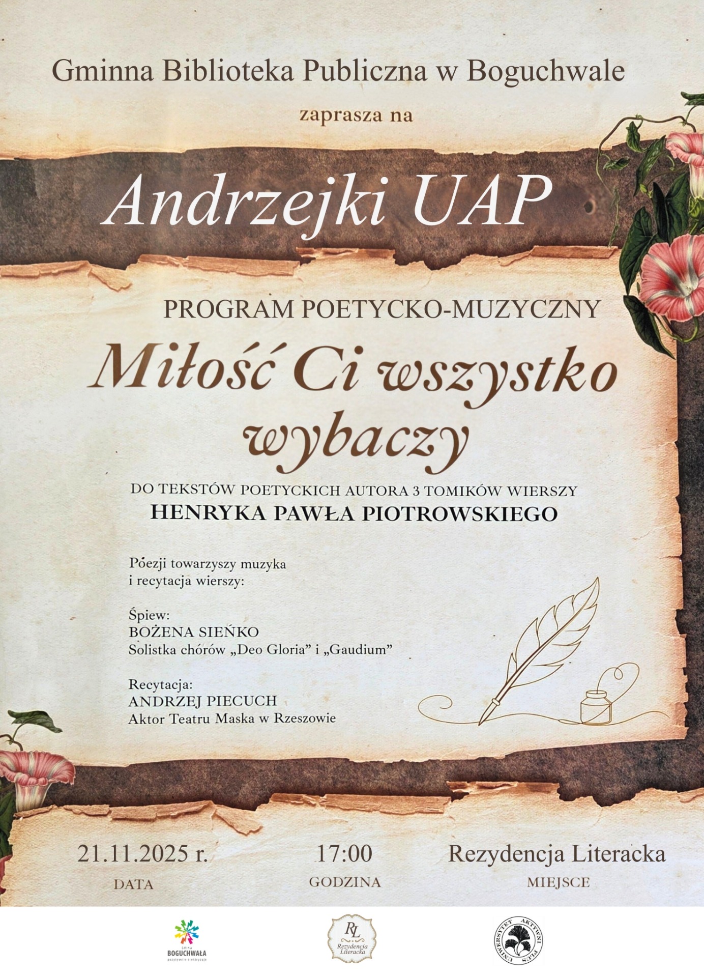 Gminna Biblioteka Publiczna w Boguchwale zaprasza na wyjątkowy wieczór poetycko–muzyczny pt. „Miłość Ci wszystko wybaczy”, oparty na tekstach poetyckich Henryka Pawła Piotrkowskiego – autora trzech tomików wierszy.