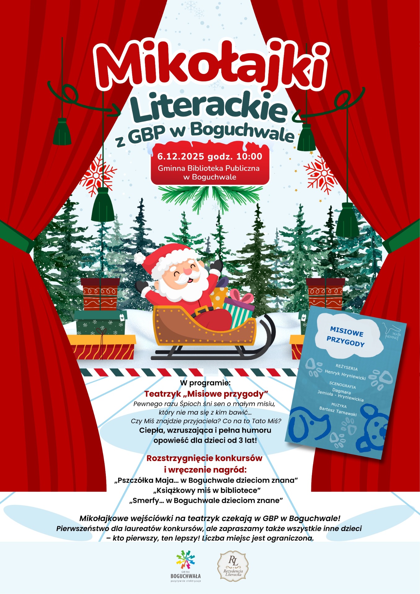 Gminna Biblioteka Publiczna w Boguchwale serdecznie zaprasza dzieci wraz z rodzinami na wyjątkowe Mikołajki Literackie, które wprowadzą najmłodszych w świąteczny nastrój poprzez teatr, zabawę i literackie emocje.